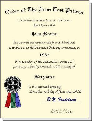 The "Order of the Iron Test Pattern" is an association of people who have made technical contributions to the television industry for more than 15 minutes. The quality of contribution is not important. Merely surviving and keeping a sense of humor IS!