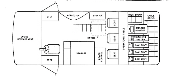 In the back were cable reels, I hated them, as it took 2 engineers to slowly un-reel each cable. Some trucks had the reels removed, so you could stack extra cable and more equipment in the back of the truck. In the 1948 truck, the reels flipped out to the sides, so you could have access to the back of the camera CCUs, and power supplies.