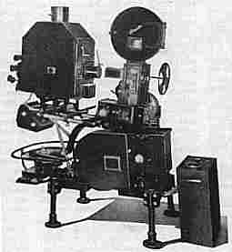 1928 35mm sound projector, using a Western Electric Universal Base, topped with a Simplex 35mm projector head, and upper magazine, and a low intensity carbon arc lamp house. The item in front of the projector is possibly a ballast for the carbon arc lamp.